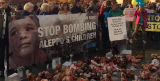Залитые красной краской плюшевые медвежата символизируют детей, погибших во время войны в Сирии
