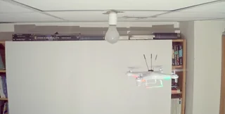 Сначала аппаратом надо было раскрутить старую лампочку, опустить ее, поднять к потолку новую и прикрутить ее на место. В процессе съемки видеоблогер разбил несколько лампочек и один дрон.
