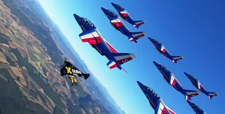 Французская пилотажная группа Patrouille de France и три экстремала с реактивными ранцами-крыльями совершили совместный полет. Видео этого события выложено на YouTube.