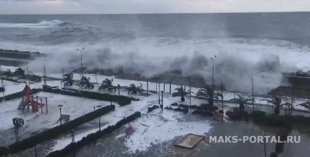 В российском курорте Сочи введен режим повышенной готовности экстренных служб из-за ураганного ветра и шторма. Волны высотой в несколько метров уже затапливает первые этажи отелей, которые находятся ближе всего к берегу моря, сообщает местное издание Maks Portal.