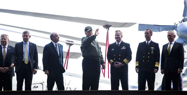 Перед экипажем нового корабля выступил президент США Дональд Трамп, который заявил, что авианосец "представляет собой будущее американской морской авиации" и станет великолепным дополнением для военно-морского флота.