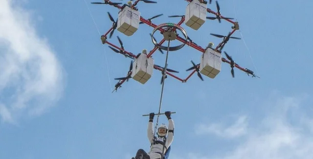 Использованный дрон был разработан компанией Aerones. Он оснащен 28 двигателями и способен поднимать в воздух груз весом до 200 килограммов. Подготовка к прыжку длилась шесть месяцев.