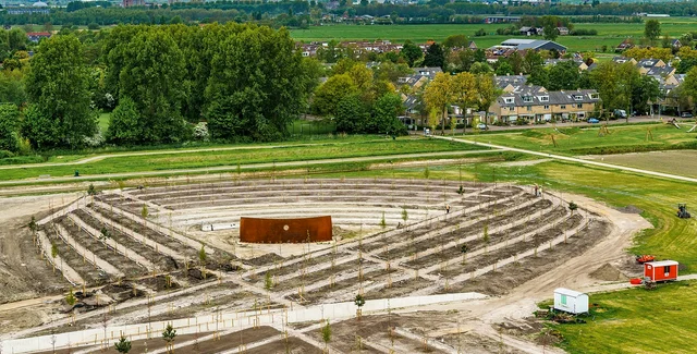 Деревья высажены так, что образуют собой большую ленту, которая символизирует память по погибшим.