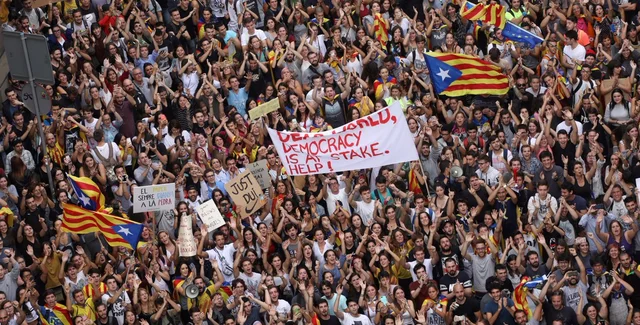 Люди собрались на центральной площади города, держа испанские и каталонские флаги. Демонстранты скандируют "Каталония – Испания" и призывают отправить в тюрьму президента Каталонии Карлеса Пучдемона.