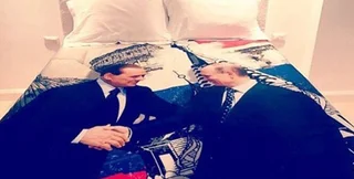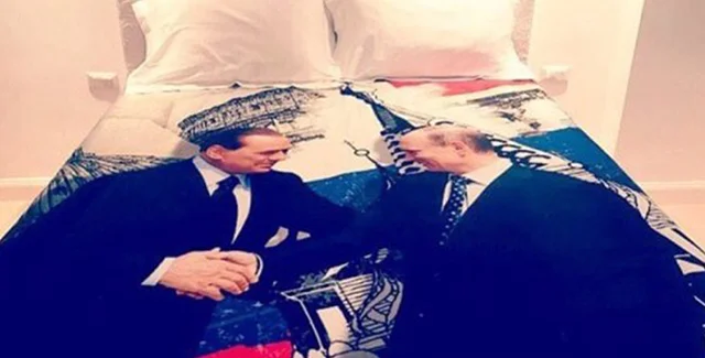 На пододеяльнике изображено рукопожатие двух политиков на фоне достопримечательностей России и Италии — собора Василия Блаженного и Колизея.