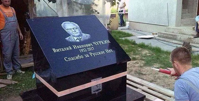 Монумент представляет собой памятную доску на черном постаменте с портретом, именем, отчеством и фамилией и годами жизни (1952-2017) Виталия Чуркина, а также надписью "Спасибо за Русское Нет".