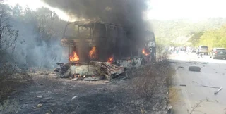 Двухэтажный пассажирский автобус столкнулся на трассе с грузовиком, после чего загорелся.