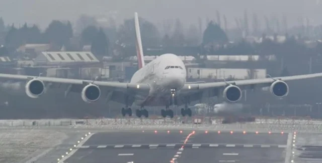 Посадку крупнейшего серийного авиалайнера в мире Airbus А380-800 компании Emirates в аэропорту Бирмингема 1 и 2 марта сняли на видео.