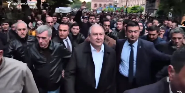 В 19:00 Саркисян в окружении охраны прибыл на Площадь Республики, где проходил многотысячный протест. Митингующие встретили его аплодисментами и криками "Президент, отвергни Сержа" и "Президент, сделай шаг".