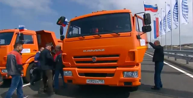 В рамках церемонии открытия Путин побывал в центре управления, который будет круглосуточно контролировать эксплуатацию моста, и поговорил с рабочими, которые его строили. После этого российский президент за рулем КамАЗа проехал по мосту вместе с колонной строительной техники.