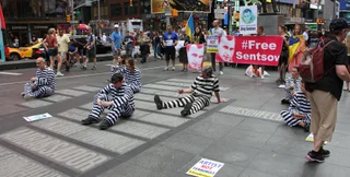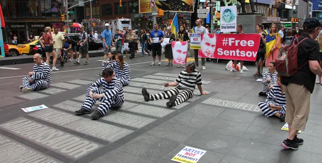Около полусотни участников акции вышли на Таймс-сквер с требованием освободить Сенцова из заключения. Несколько участников акции оделись в тюремные робы и сели посреди улицы с песочными часами в руках.
