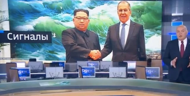 В воскресном выпуске "Вестей недели" на телеканале "Россия 1" показали сюжет о встрече главы МИД РФ Сергея Лаврова и лидера КНДР Ким Чен Ына. Пока ведущий Дмитрий Киселев рассказывал детали переговоров, на заднем фоне появилось фото рукопожатия главы Северной Кореи и российского министра. Об этом пишет TJournal.