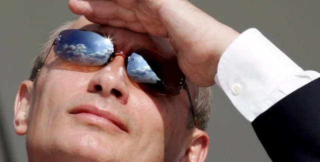В центре картины находится Путин в золотых доспехах и в колеснице, запряженной тремя лошадьми.
