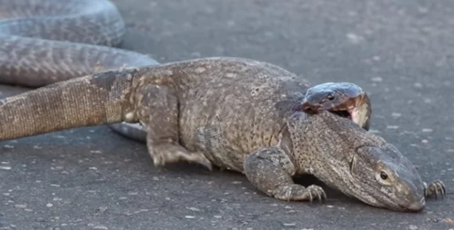 Позднее варан пытался вырваться, и ему это на какое-то время удалось. Тем не менее, кобра догнала его и укусила за морду. Затем проезжающий мимо автомобиль спугнул змею, а варан остался неподвижно лежать на дороге.
