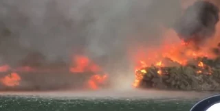 В американском городе Блайт сняли на видео огненный торнадо, который вынес дым от пожара на высоту до восьми километров.