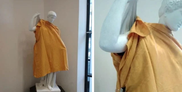 Администрация Новосибирского государственного университета архитектуры и дизайна (НГУАДИ) перед визитом представителей РПЦ прикрыла тканью статуи обнаженных людей тканью и закрепила их канцелярскими зажимами.