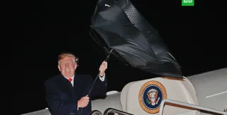 Президент Соединенных Штатов Америки не смог закрыть зонт перед входом в самолет и бросил его на трап.
