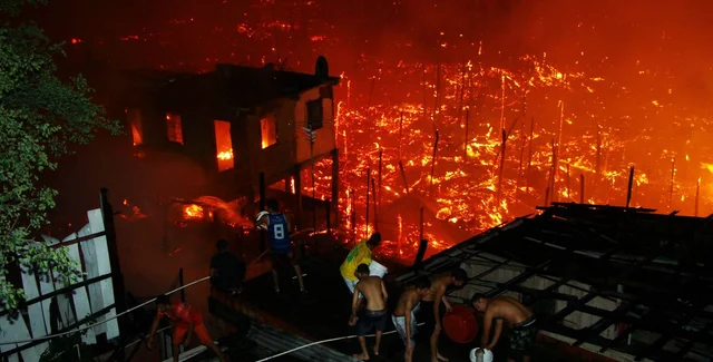 Огонь быстро разгорался. Тушение пожара затруднялось тем, что это бедный район, где дома часто построены из дерева и строительного мусора в абсолютно хаотичном порядке и к ним не подведен водопровод.