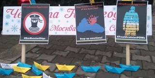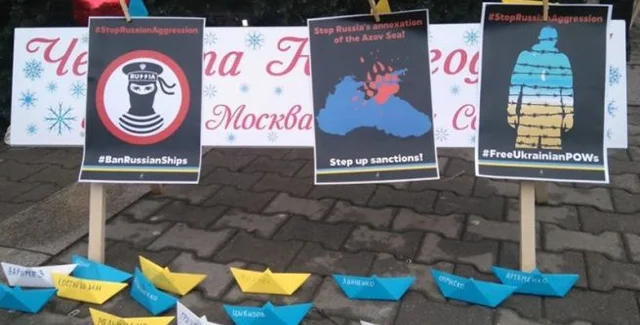 Сообщается, что активисты требовали освобождения пленных моряков ВМС Украины. Активисты развернули украинский флаг и размахивали плакатами с требованием остановить российскую агрессию.