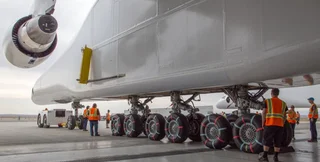 Длина самолета составляет 73 метра, а максимальный взлетный вес равен почти 600 тоннам. Масса подвесной полезной нагрузки — 230 тонн.