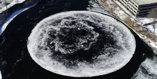 По информации ВВС, такое явление может возникнуть на изгибах рек, когда более сильное течение равномерно омывает замерзшую воду и собирает в эпицентр водоворота куски льда.