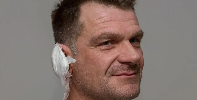 Оказалось, что у него разбита голова, повреждено ухо, два пальца на руке и многочисленные ушибы на предплечьях и руках.