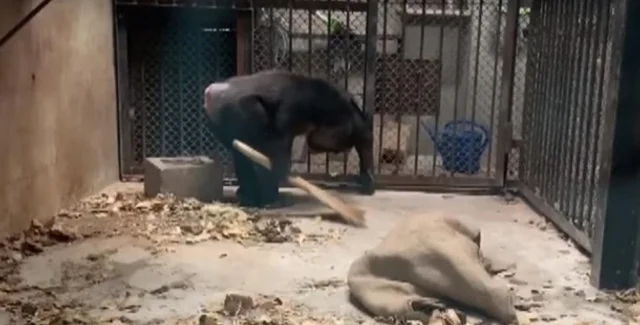 Обезьяны понаблюдали, как убирается зверинец и сами стали чистить свои вольеры