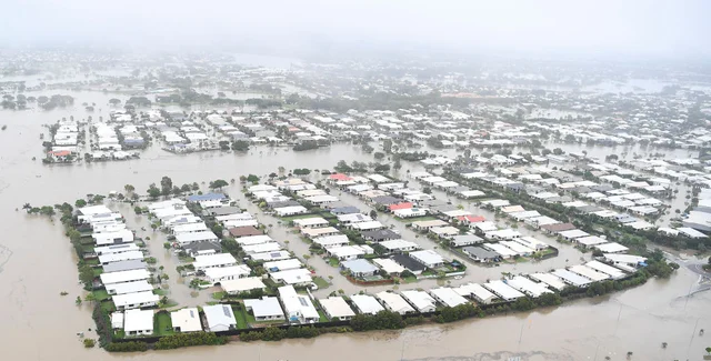 Вид сверху на город Таунсвилл. Городские власти намеренно открыли дамбу на реке Росс, чтобы снизить ущерб от наводнения из-за проливных дождей. В результате было затоплено около 2000 домов.