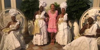 Гостей на вечеринке встречали темнокожие женщины, одетые в традиционные костюмы. С ними фотографировались гости вечеринки. Также они стояли у кресла виновницы торжества.