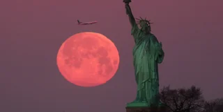 Большая снежная Луна позади Статуи Свободы во время восхода солнца 19 февраля 2019 года в Нью-Йорке.