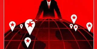 На обложке в кроваво-черных тонах стоит российский лидер, опираясь руками на земной шар. На континентах размещены указатели с красными звездами.