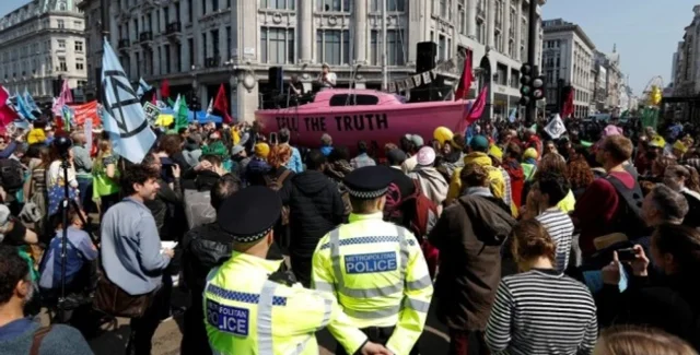 "Тысячи экологических активистов парализовали улицы в центре Лондона, пытаясь заставить правительство делать больше для борьбы с изменением климата", – говорится в сообщении.