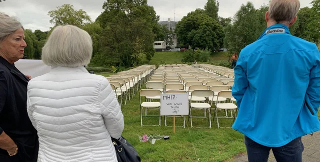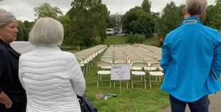 Люди установили у посольства 298 белых стульев, как в самолете, включая проходы. Они символизируют 298 жертв MH17.