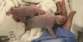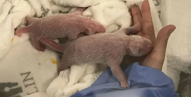 Новорожденные панды появились на свет с интервалом менее часа и сейчас, мало похожи на своих родителей. У малышей розовая кожа с белым пушком, а также длинные хвостики.