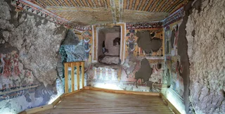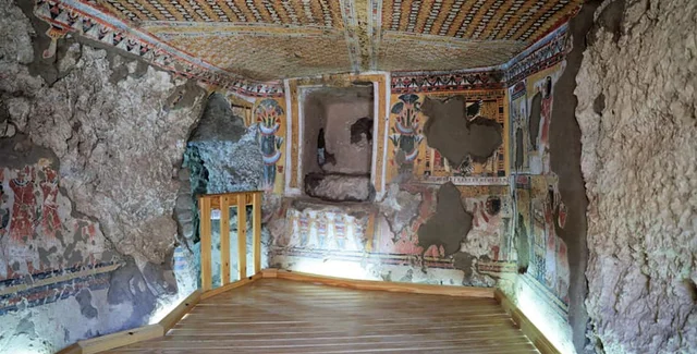 На восстановленных стенах гробниц видны яркие рисунки. В одной расположены статуи погребенного, его жены и священника.