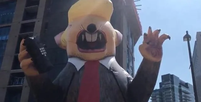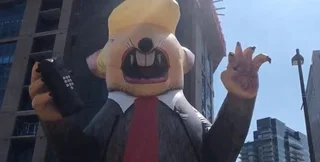 Грызун напоминает американского лидера белокурой шевелюрой и красным галстуком, а в лапке он держит мобильный телефон. Шар был поднят жителями города над улицей Президент-стрит. К шару прикрепили стикер со словами "Борись с фашизмом, останови Трампа". Также граждане вышли с предложением переименовать улицу в "проспект президента Барака Обамы" в честь бывшего лидера США.