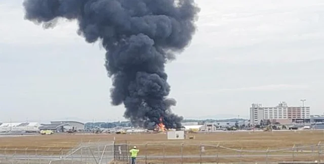 Уточняется, что воздушное судно загорелось после падения на взлетно-посадочную полосу.