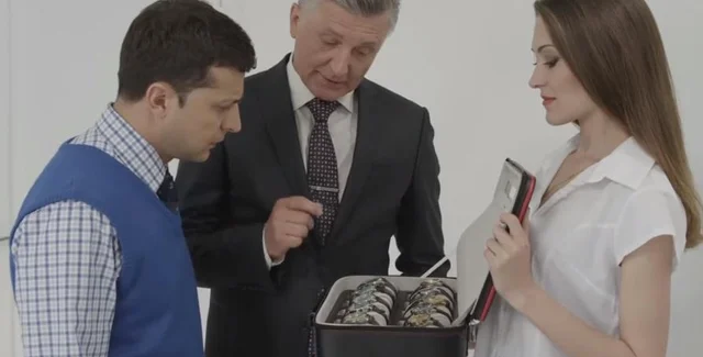 По сюжету телефильма, новый президент Украины, типичный школьный учитель Голобородько, приходит покупать себе брендовые часы и костюм. Помощник подсказывает ему, что президент РФ Путин носит часы швейцарской торговой марки Hublot (произнося ее название как "хубло"). Герой Зеленского в ответ удивляется: "Путин – "хубло"?" При показе сериала на ТНТ эту сценку вырезали. При этом, склейка на месте этой части сериала была заметна.