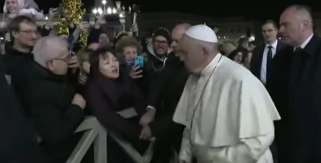 Понтифик во вторник, 31 декабря, общался с верующими на улице. Одна из женщин схватила Франциска за руку из-за заграждения, когда тот проходил мимо, в ответ он несколько раз шлепнул ее по рукам.