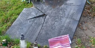 Теперь же таблица разбита на мелкие кусочки, которые выбросили в яму. Также сорваны вышитые рушники с деревьев, которые осенью повесили польские активисты.