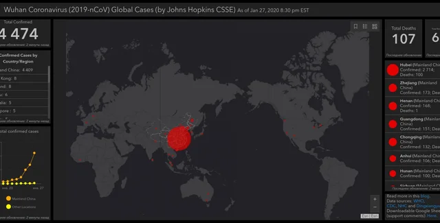 Американские исследователи Центра системных наук и инженерии при Университете Хопкинса запустили сайт, на котором в режиме реального времени можно наблюдать распространение нового китайского коронавируса 2019-nCov. Интерактивная карта находится на портале gisanddata.maps.
