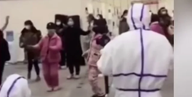 Медсестры в белых защитных костюмах, очках, перчатках и синих сапогах станцевали для больных под ритмичные китайские песни.