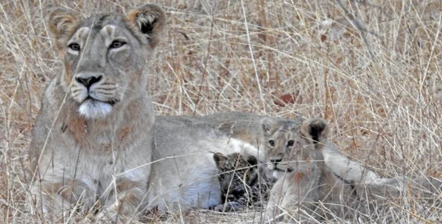 В национальном парке Индии "Гирский лес" львица "усыновила" и выходила больного детеныша леопарда.
