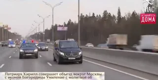 Патриарший кортеж в сопровождении полиции проехал по внешней стороне МКАД, протяженность которой составляет 109 км. Все происходящее транслировалось в прямом эфире телеканала "Спас", ведущие которого молись.