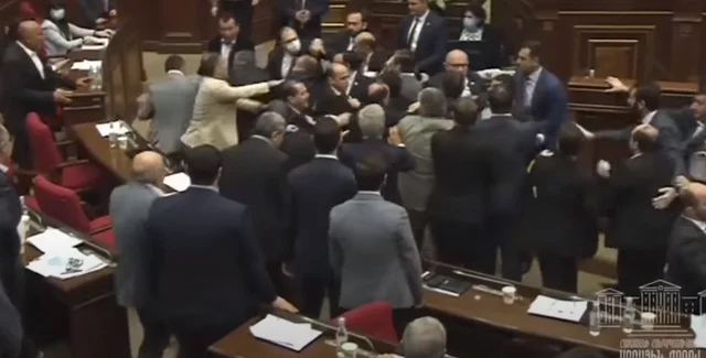 Оказалось, что реплики отпускал депутат из правящей партии Сасун Микаэлян и между двумя парламентариями началась драка. Позже к ним присоединились остальные депутаты и заседание было сорвано. Депутаты кричали и рвали друг на друге рубашки.