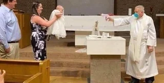 На фотографии, появившейся в социальных сетях, видно, как священник в церкви направляет водяной пистолет на ребенка, которого принесли для обряда крещения. Мать, отец и ребенок находятся на большой дистанции от священника в маске, что продиктовано правилами социального дистанцирования во время пандемии.