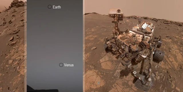 Curiosity cфотографировал Венеру и Землю на камеру Mastcam, примерно через 75 минут после захода солнца 5 июня 2020 года (на 2784-й Марсианский день своей миссии).