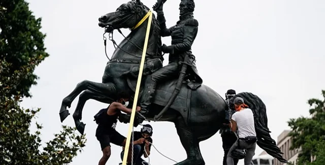В Вашингтоне демонстранты пришли на площадь Лафайет-сквер, где находится статуя седьмого президента США Эндрю Джексона, накинули на нее веревки и цепи, и принялись раскачивать памятник с целью опрокинуть.