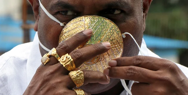 По-богатому. В Индии мужчина носит золотую маску от коронавируса