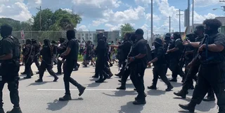 Десятки демонстрантов с полуавтоматическими винтовками и дробовиками, одетые в черное военизированное снаряжение, прошли 25 июля строем к перекрытому перекрестку, где они были отделены полицией от небольшой группы вооруженных контр-протестующих. Об этом сообщило Reuters.